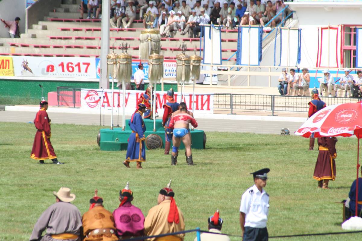 Mongolian wrestling is somewhere between Sumo wrestling and a shoving match – the first guy to put a knee on the ground looses. There are no weight classes so of the 512 participants in the first round – you can usually put your money on the fattest two reaching the final.